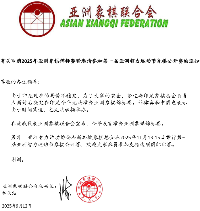 由本会主办、马来西亚象棋总会承办、吉隆坡象棋公会协办的"合力杯"第19届亚洲象棋个人锦标赛暨第3届亚洲象棋个人公开赛将在9月24日至29日在吉隆坡帝盛酒店举行。赛会期间,本会将于9月25-26日召开两项会议,对亚洲象棋运动的发展进行讨论。